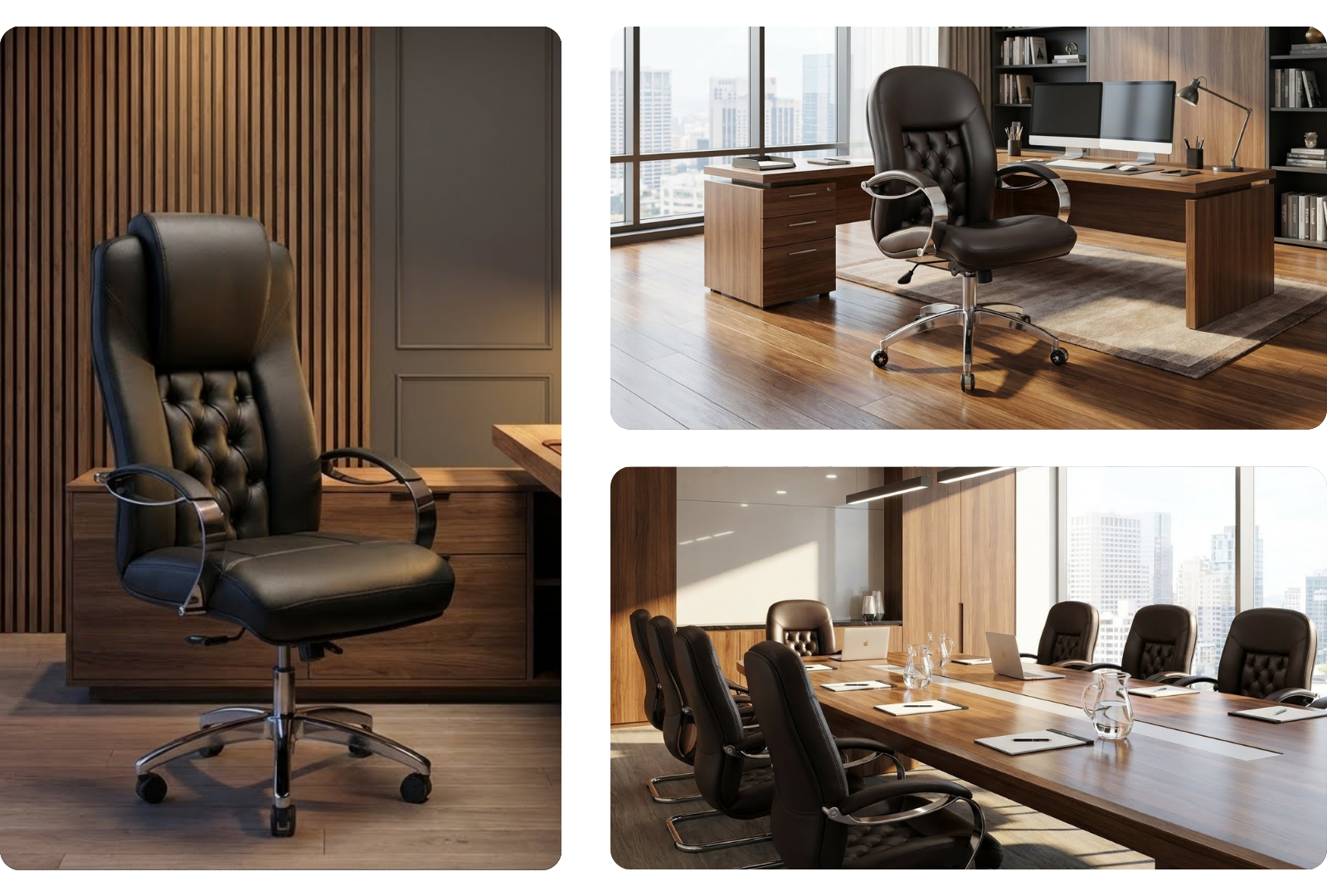 | Malzeme | Premium suni deri döşeme • Kapitone sırt paneli • Krom kaplama kavisli kolçaklar • 5 kollu krom yıldız ayak • Sessiz tekerlek sistemi. |