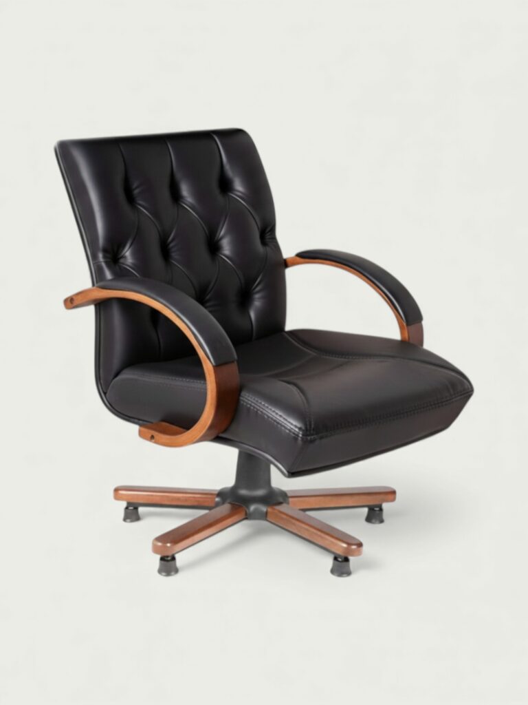 | Tasarım | Kapitone döşeme detaylarına sahip klasik yönetici misafir koltuğu formu. Orta sırt yapısı ve lake ahşap kolçak tasarımı ile makam odaları için prestijli bir görünüm sunar. |